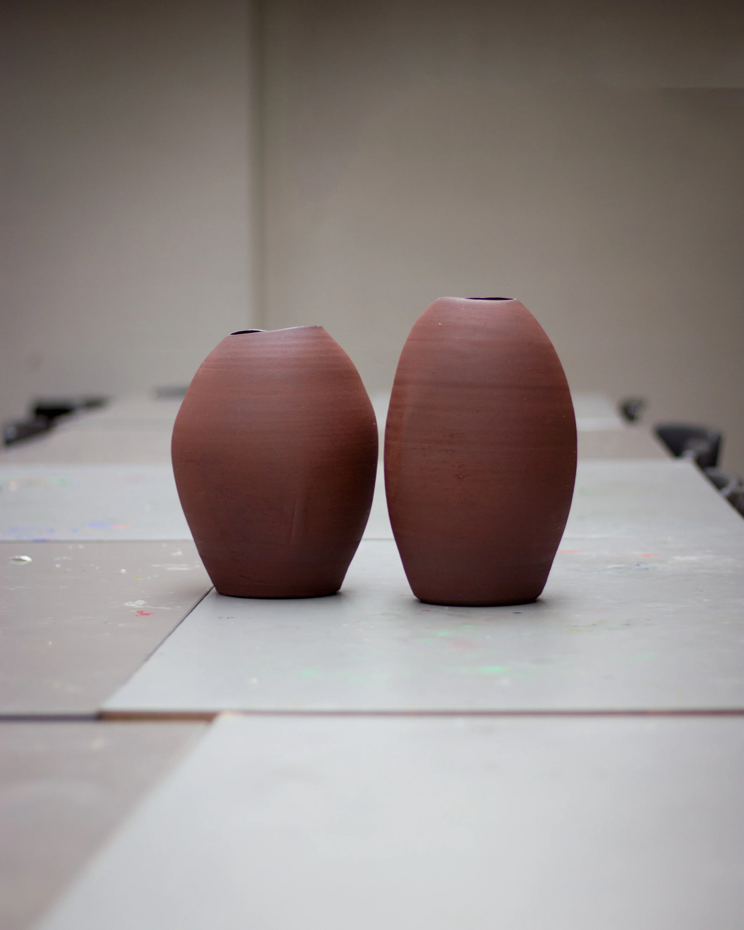 The insides are glazes with a clear glaze simultaneously ensuring their functionality whilst providing a subtle glossy contradiction to the matt exterior. This range of vessels were created from four clays: White, Sandstone, Red and Black.